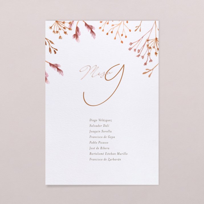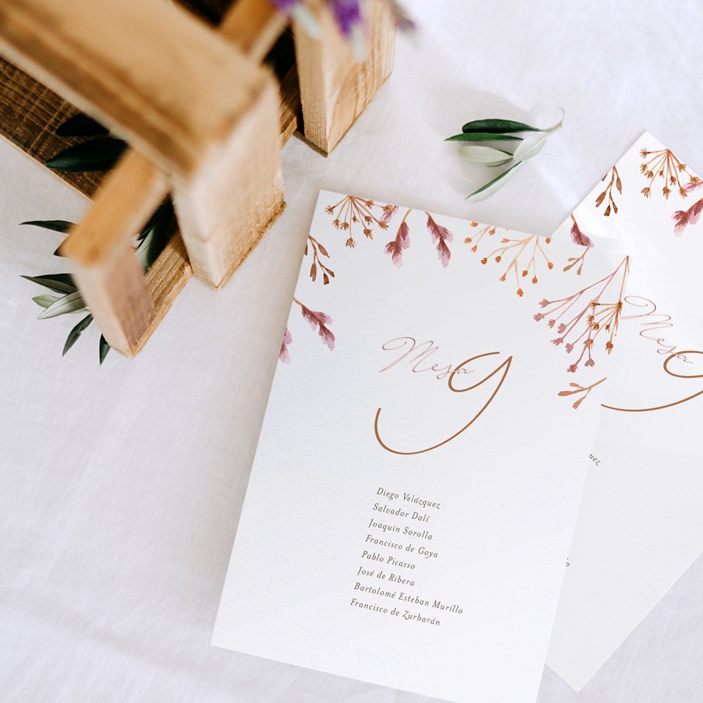 Hoja grande con los nombres de los invitados y sus respectivas mesas. Una hoja por mesa, cada una con su nombre (si tenéis un tema, como por ejemplo canciones, flores, lugares...), y la lista de las personas de esta mesa.