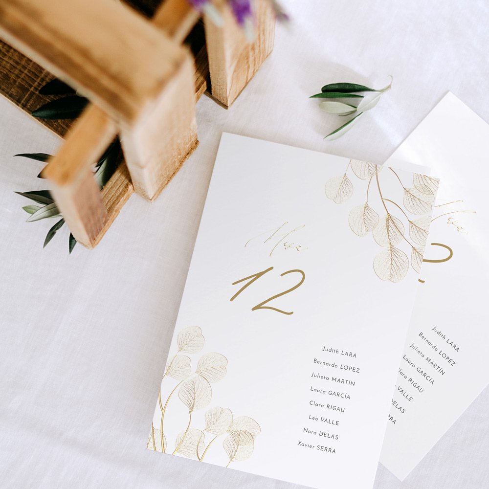 Hoja grande con los nombres de los invitados y sus respectivas mesas. Una hoja por mesa, cada una con su nombre (si tenéis un tema, como por ejemplo canciones, flores, lugares...), y la lista de las personas de esta mesa.