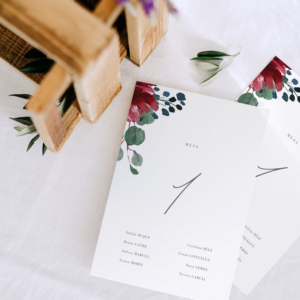 Hoja grande con los nombres de los invitados y sus respectivas mesas. Una hoja por mesa, cada una con su nombre (si tenéis un tema, como por ejemplo canciones, flores, lugares...), y la lista de las personas de esta mesa.