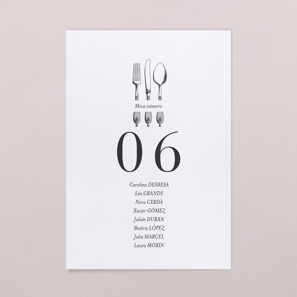 Hoja grande con los nombres de los invitados y sus respectivas mesas. Una hoja por mesa, cada una con su nombre (si tenéis un tema, como por ejemplo canciones, flores, lugares...), y la lista de las personas de esta mesa.