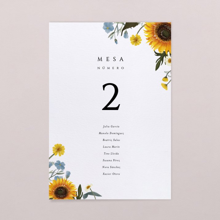 Hoja grande con los nombres de los invitados y sus respectivas mesas. Una hoja por mesa, cada una con su nombre (si tenéis un tema, como por ejemplo canciones, flores, lugares...), y la lista de las personas de esta mesa.