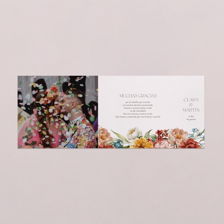 Agradece a tu familia y amigos su presencia en vuestro día con esta bonita tarjeta de agradecimiento de boda. En gran formato horizontal que se puede personalizar tanto en la cara como en el dorso con vuestra foto y el mensaje que queráis transmitir.