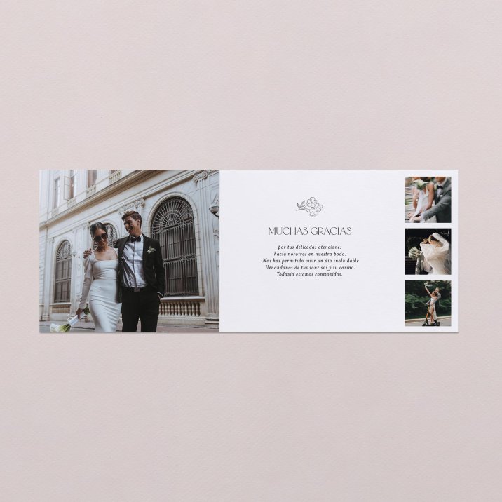 Agradece a tu familia y amigos su presencia en vuestro día con esta bonita tarjeta de agradecimiento de boda. En gran formato horizontal que se puede personalizar tanto en la cara como en el dorso con vuestra foto y el mensaje que queráis transmitir.