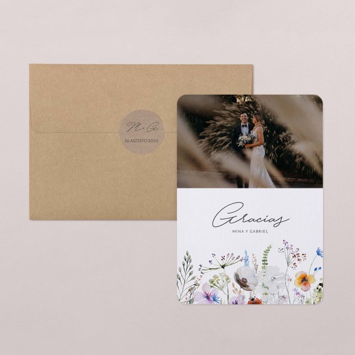 Imprimiremos vuestras fotos en la cara y el texto en el dorso de vuestra tarjeta de agradecimiento.