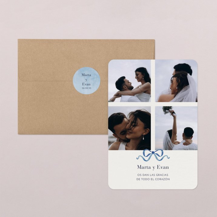 Una tarjeta de agradecimiento como recuerdo de vuestra boda con vuestras mejores fotos. El regalo ideal para agradecer a familia y amigos y recordarles los grandes momentos vividos y compartidos.