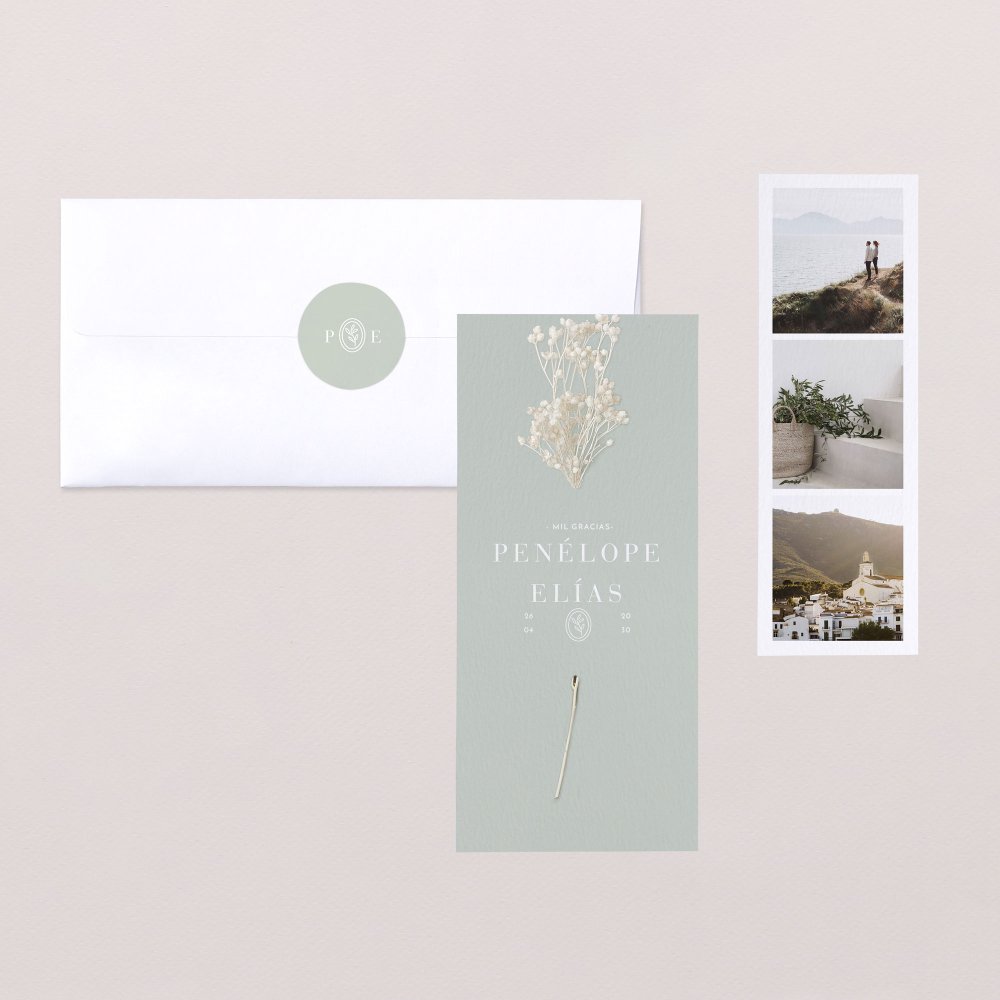 Tarjeta de agradecimiento compuesta por un díptico y un fotomatón con 3 fotos, el fotomatón se colocará en el interior del díptico y será un recuerdo para vuestros familiares y amigos.