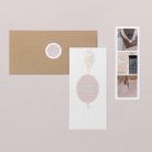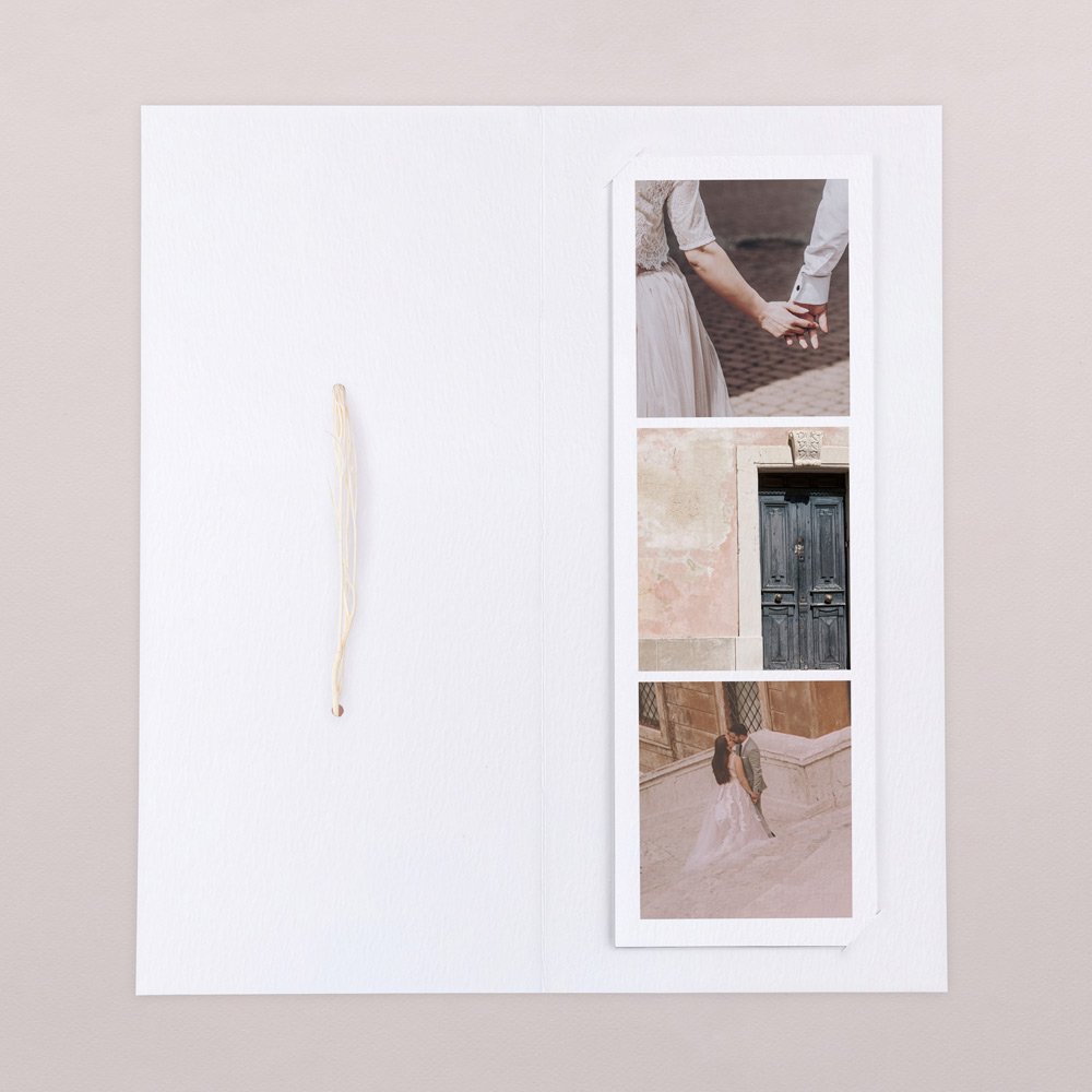 Tarjeta de agradecimiento compuesta por un díptico y un fotomatón con 3 fotos, el fotomatón se colocará en el interior del díptico y será un recuerdo para vuestros familiares y amigos.