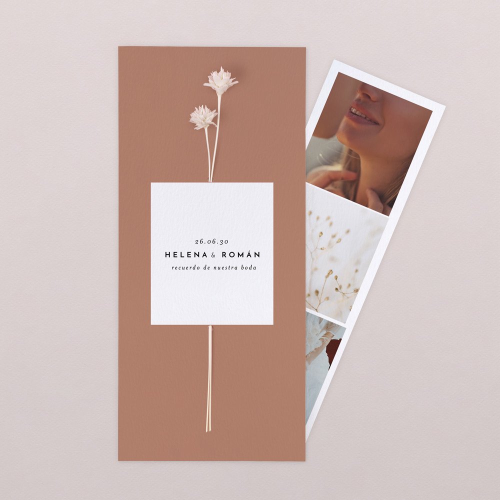 Tarjeta de agradecimiento compuesta por un díptico y un fotomatón con 3 fotos, el fotomatón se colocará en el interior del díptico y será un recuerdo para vuestros familiares y amigos.