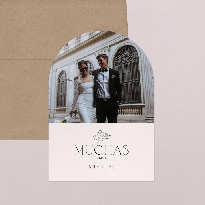 Agradece a tu familia y amigos su presencia en vuestro día con esta bonita tarjeta de agradecimiento de boda. En formato de arco que se puede personalizar tanto en la cara como en el dorso con vuestra foto y el mensaje que queráis transmitir.