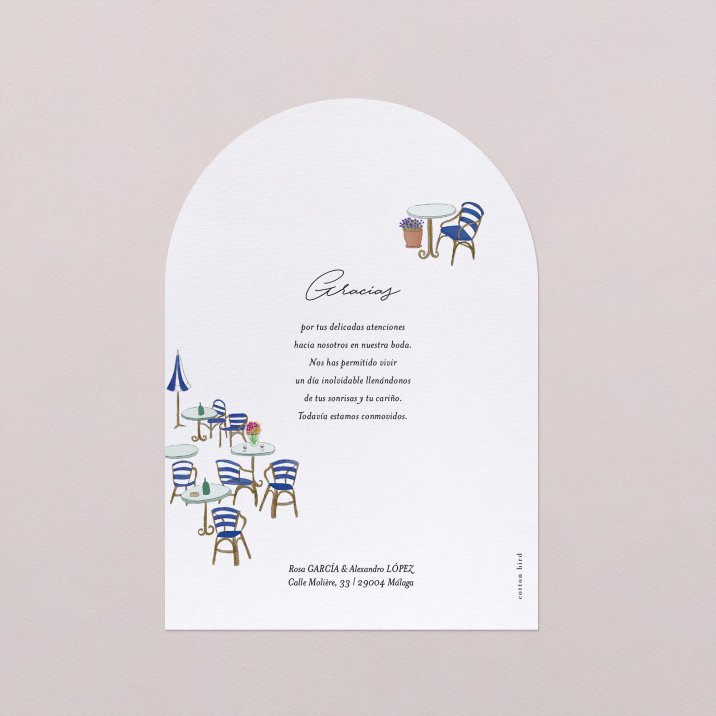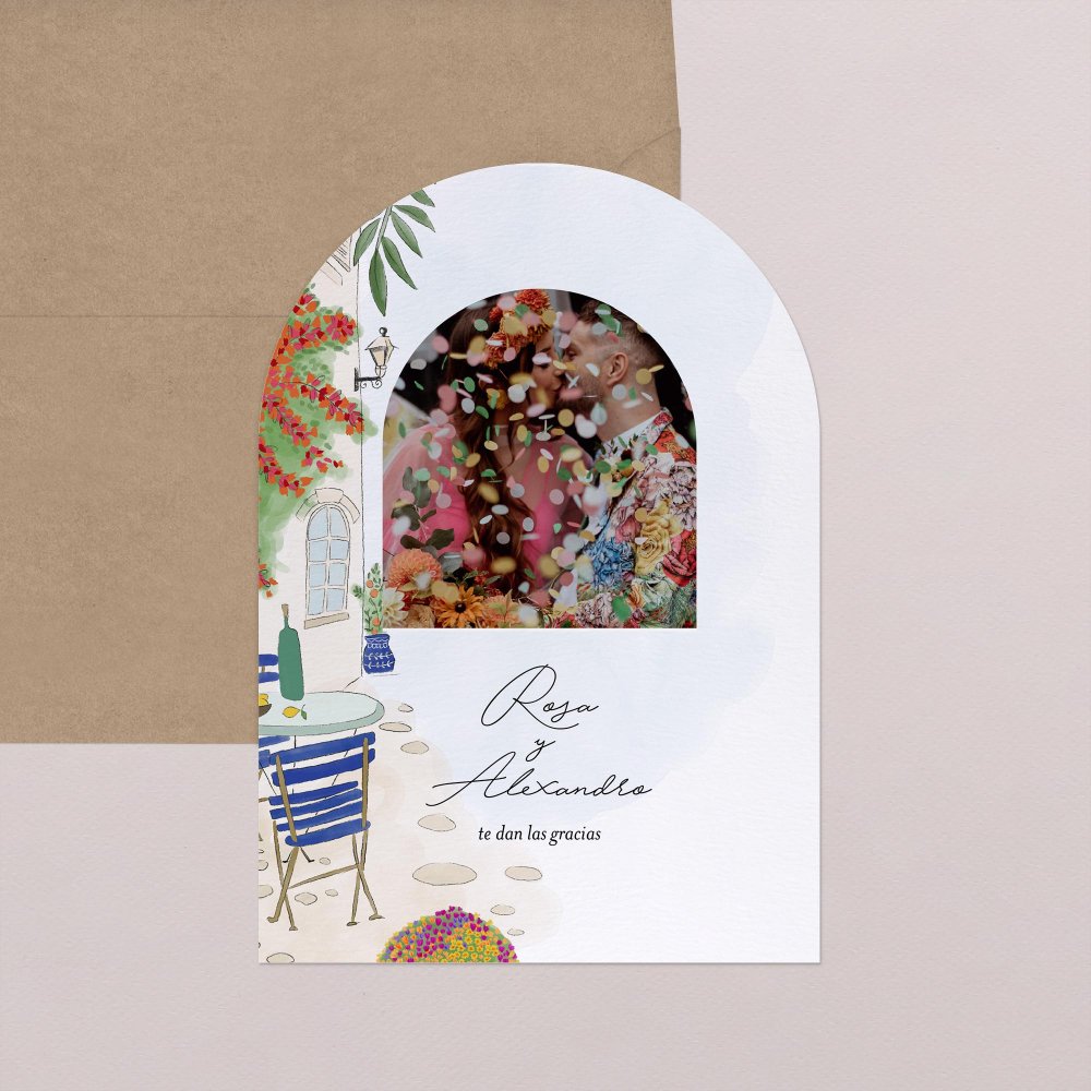Agradece a tu familia y amigos su presencia en vuestro día con esta bonita tarjeta de agradecimiento de boda. En formato de arco que se puede personalizar tanto en la cara como en el dorso con vuestra foto y el mensaje que queráis transmitir.