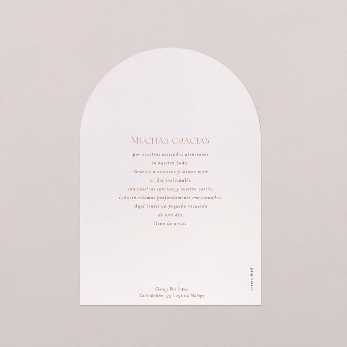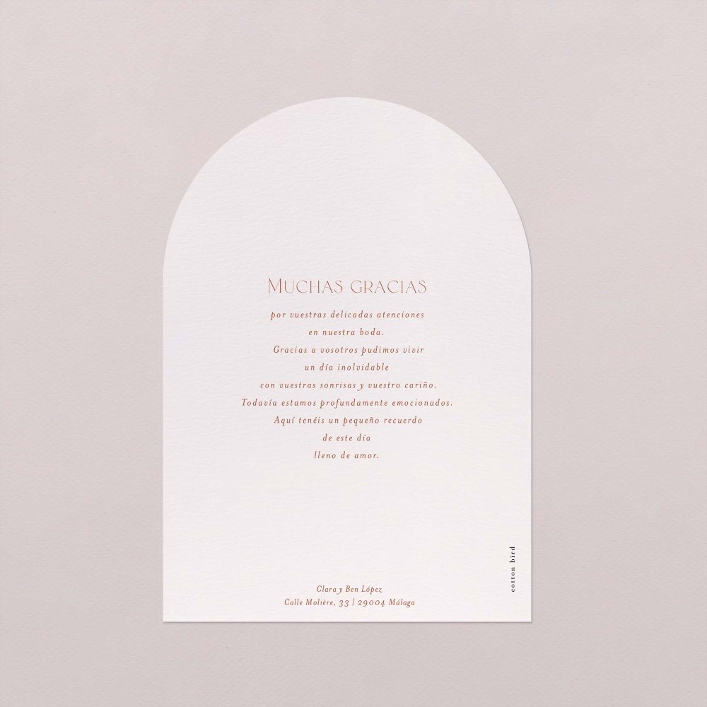 Agradece a tu familia y amigos su presencia en vuestro día con esta bonita tarjeta de agradecimiento de boda. En formato de arco que se puede personalizar tanto en la cara como en el dorso con vuestra foto y el mensaje que queráis transmitir.