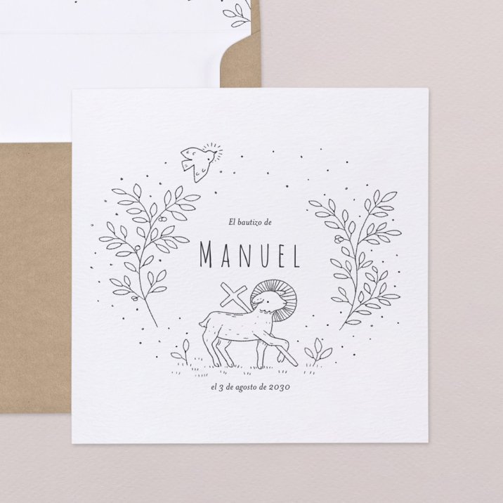 El corderito, la paloma y la cruz: la invitación para bautizo Woody presenta un escenario lleno de significado para el bautizo de tu hijo. Estos bonitos y simbólicos bocetos se combinan con delicadas ramas de olivo colocadas adornando el nombre de tu hijo en una invitación llena de dulzura.