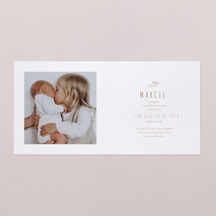 En nuestra invitación Origami I, el arte del plegado del papel nos ha inspirado para crear un vuelo de palomas con siluetas minimalistas y lúdicas para el bautizo de tu hijo. Con sublimes detalles dorados, este modelo de aspecto contemporáneo aportará un toque de originalidad a tu invitación, a la vez que la adorna con elegancia.