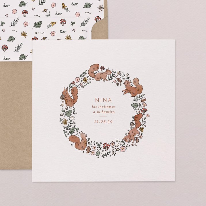 En esta invitación de bautizo unas encantadoras ardillas forman una corona de estilo campestre. Un ambiente que recuerda a los antiguos libros de cuentos ilustrados para invitar a tus seres queridos con el modelo Ardillas.