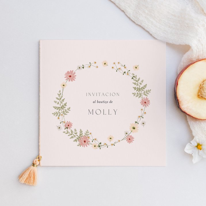 Con su hermosa guirnalda de flores ilustrada, la invitación de bautizo Carlina anunciará tu feliz noticia con una ternura infinita.