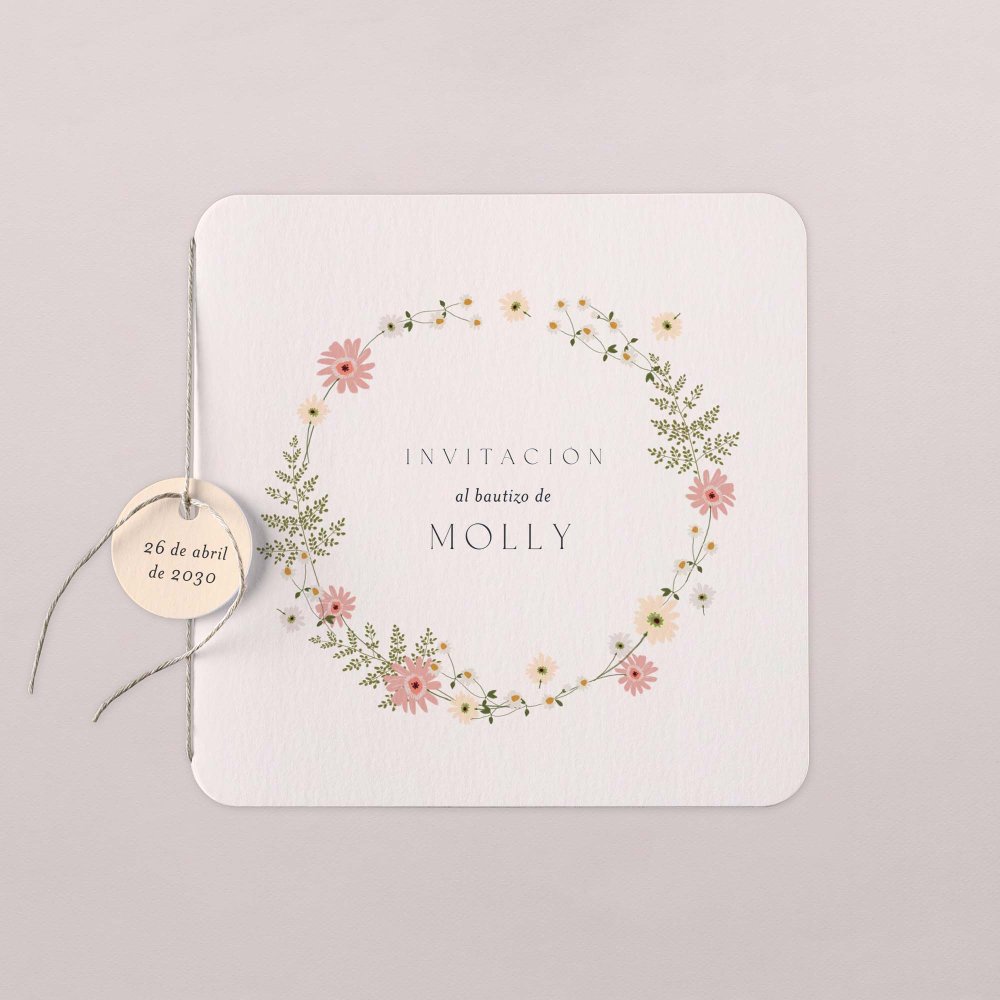 Con su hermosa guirnalda de flores ilustrada, la invitación de bautizo Carlina anunciará tu feliz noticia con una ternura infinita.