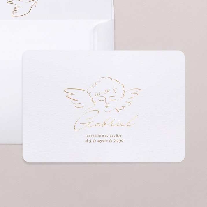 Combina tradición y modernidad con la invitación Querubines. El querubín finamente dibujado en estilo minimalista será el mensajero divino que anuncie el bautizo de tu hijo. Un modelo puro y elegante con un diseño realzado con detalles dorados.