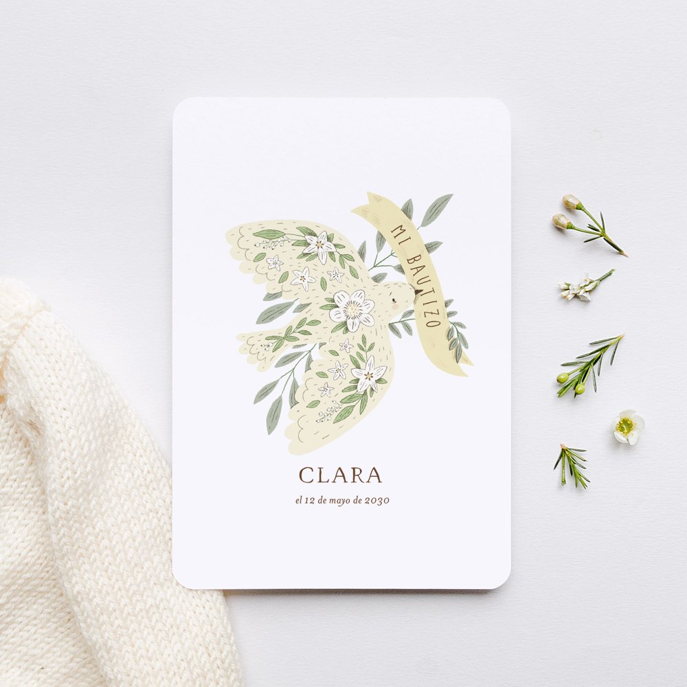 En la invitación de bautizo Dulce mensajero una paloma anuncia el bonito evento. Un símbolo tradicional con un toque original, un plumaje decorado de flores blancas y ramas de olivo.