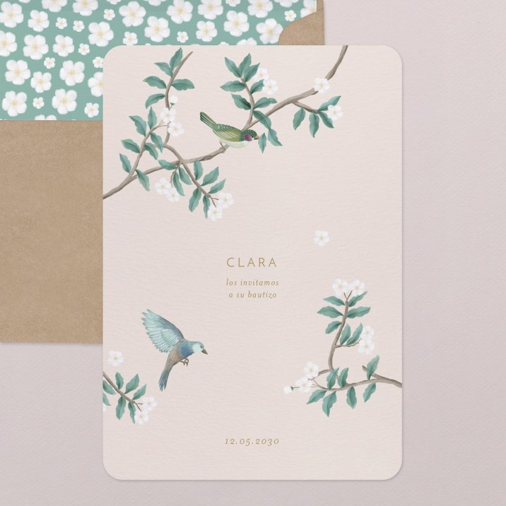 Magníficos pájaros posados en un árbol lleno de flores en la invitación Jilgueros. Personaliza este modelo con la foto de tu bebé que resaltará sobre este fondo florido combinado con los bonitos colores de los pájaros. Un bonito anuncio para un maravilloso bautizo.