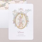 Un universo fantástico en tonos pastel se dibuja en la invitación de bautizo Medallón Encantado. Un unicornio alado, una jirafa, un elefante, un zorro y otros encantadores mensajeros se reúnen en esta creación de encanto vintage, anunciando con infinita ternura el bautizo de su pequeña niña o niño.