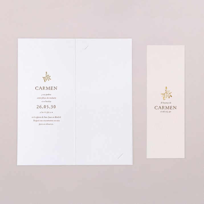 En la invitación de bautizo Octavia, las ramas de olivo doradas la iluminan junto con la foto más bonita de tu bebé. Un modelo sencillo y elegante para esta celebración.