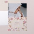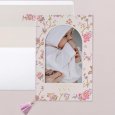 Anuncia el bautizo de tu hijo con estilo y encanto con la invitación Julietta. El nombre de tu pequeño destaca en letras doradas, adornado por un marco de flores en tonos rosados.