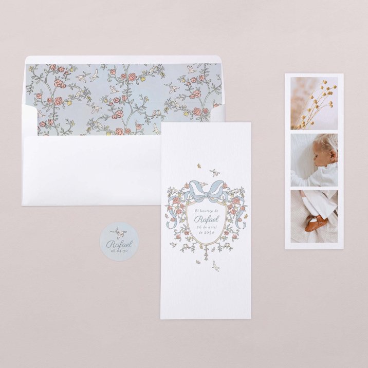 En la invitación de bautizo Arthur el nombre de tu pequeño destaca sobre un conjunto de flores rosas y amarillas, mariposas y pájaros. Una creación única con estilo vintage, ideal para anunciar el bautizo de tu bebé, niño o niña, con un toque original.