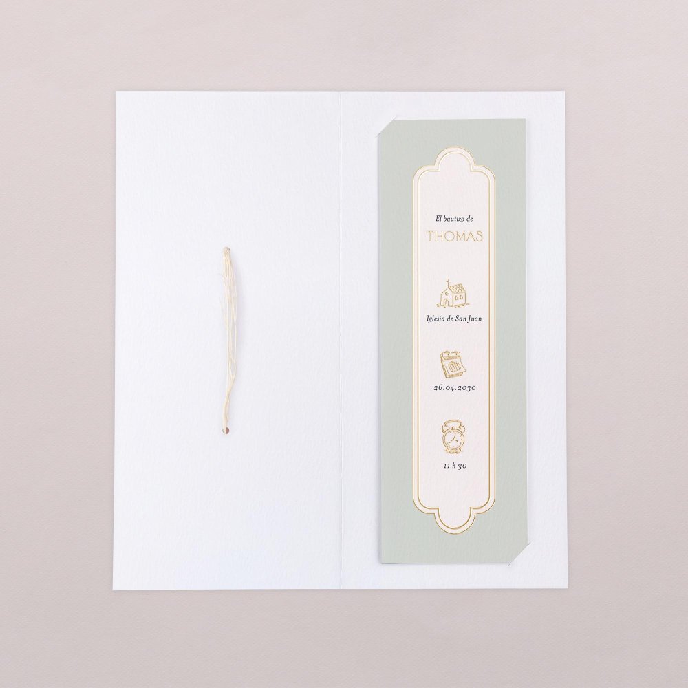 Anuncia el bautizo de tu bebé con la invitación Amadéo, donde la sobriedad y la elegancia se unen en tonos verde agua... La sencillez de esta invitación, adornada con el nombre de tu bebé bellamente caligrafiado y sublimada con un acabado dorado, encantará a tus seres queridos.