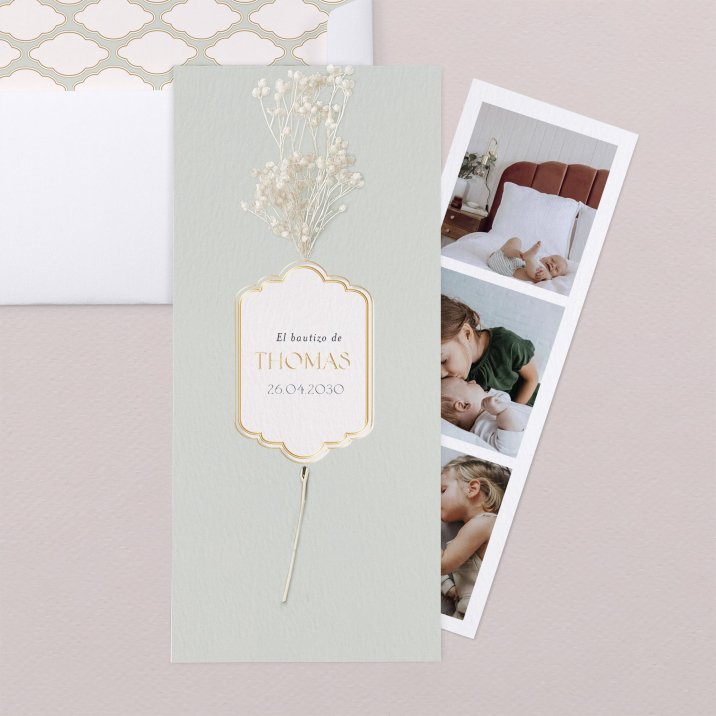 Esta invitación de bautizo, hecha con papel de calidad superior, es un díptico cuadrado que también incluye en el interior 4 fotos, además de una etiqueta con el nombre y la fecha, un recuerdo para vuestros familiares y amigos. Para colocar las flores pasa los tallos por las dos perforaciones de la tarjeta.