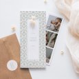 Esta invitación de bautizo, hecha con papel de calidad superior, es un díptico cuadrado que también incluye en el interior 4 fotos, además de una etiqueta con el nombre y la fecha, un recuerdo para vuestros familiares y amigos. Para colocar las flores pasa los tallos por las dos perforaciones de la tarjeta.