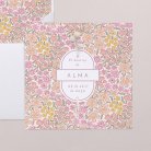 Flores en tonos pastel rosa, naranja y amarillo se mezclan en la invitación de bautizo Allegria. Una presentación colorida, perfecta para el anuncio del bautizo de tu bebé en primavera.