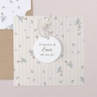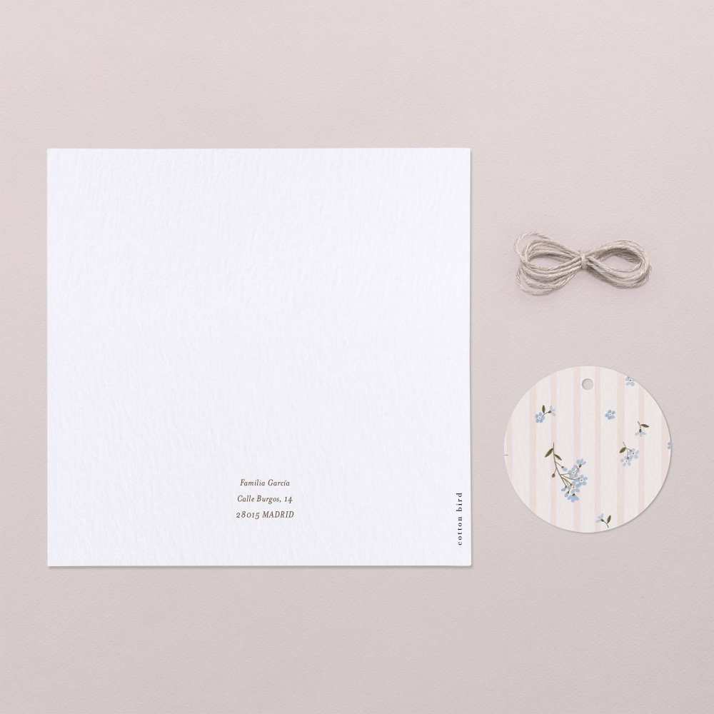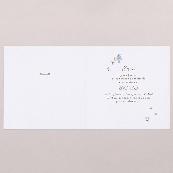 Esta invitación de bautizo, hecha con papel de calidad superior, es un díptico cuadrado que también incluye en el interior 4 fotos, además de una etiqueta con el nombre y la fecha, un recuerdo para vuestros familiares y amigos. Para fijar las flores y la etiqueta pasa la etiqueta por los dos agujeros de la tarjeta y las flores por el agujero de la etiqueta para crear un bonito efecto.