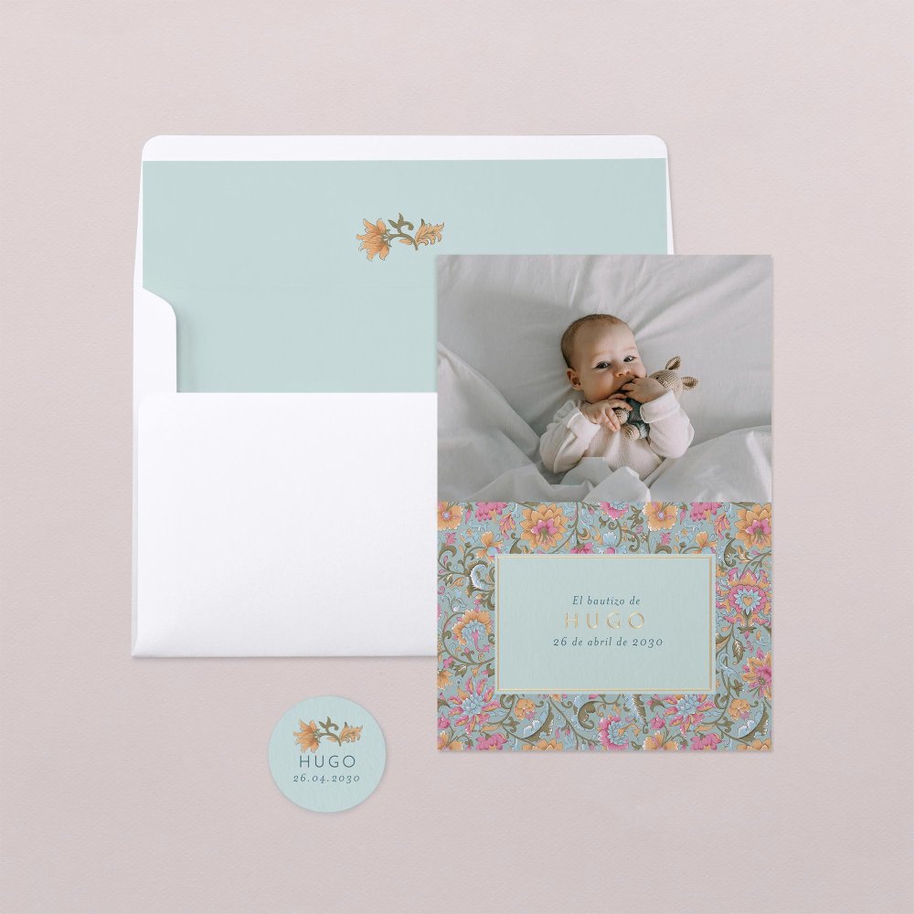 La invitación de bautizo Lajik se distingue por sus elegantes motivos florales y el nombre de tu pequeño realzado por un acabado dorado. Comparte tu alegría con tus seres queridos eligiendo esta invitación de diseño refinado, perfecta para celebrar el bautizo de tu hijo.
