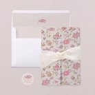 Esta invitación de bautizo se presenta en forma de tarjeta vertical con dos solapas en forma de ventana que, al abrirse, revelarán los detalles del bautizo de tu hijo. Se pueden cerrar con un bonito lazo (a elegir como suplemento).