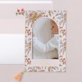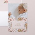 Esta invitación de bautizo se presenta en forma de tarjeta vertical con dos solapas en forma de ventana que, al abrirse, revelarán los detalles del bautizo de tu hijo. Se pueden cerrar con un bonito lazo (a elegir como suplemento).