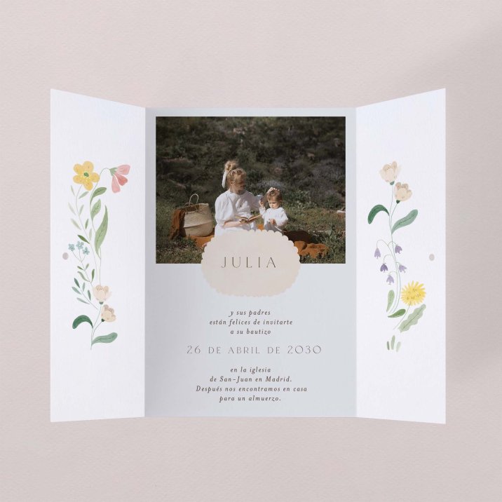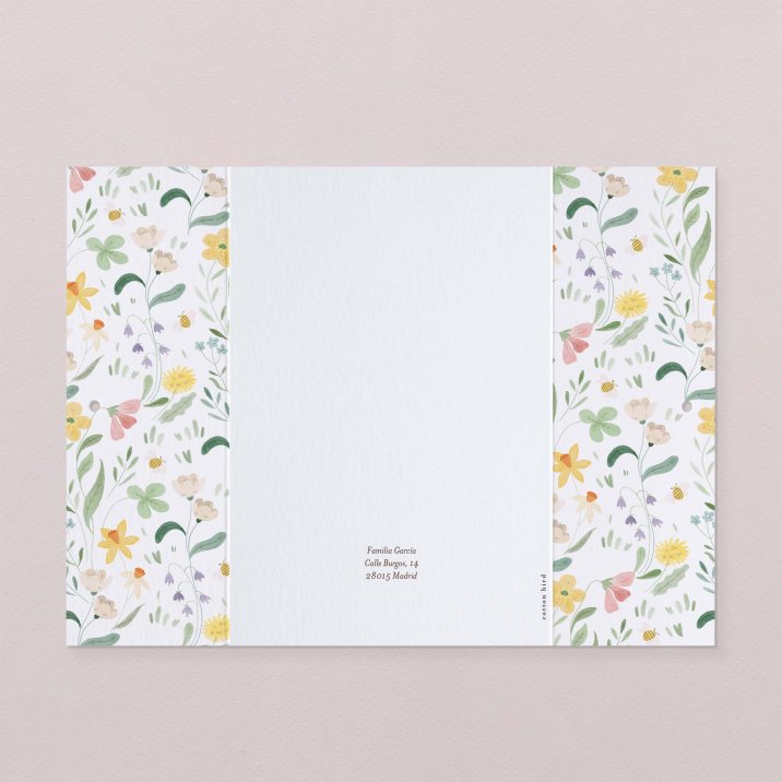 Fresca y primaveral, la invitación de bautizo Lilly Rose se viste de narcisos, violetas, diente de león y otras flores coloridas. Escondidas entre ellas hay pequeñas abejas que hacen que esta invitación sea ideal para una celebración de bautizo en primavera o en verano.