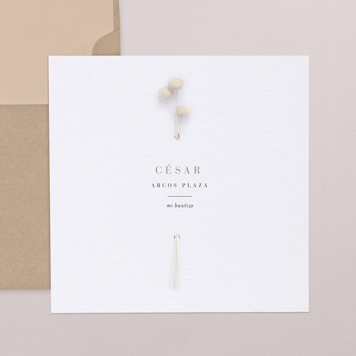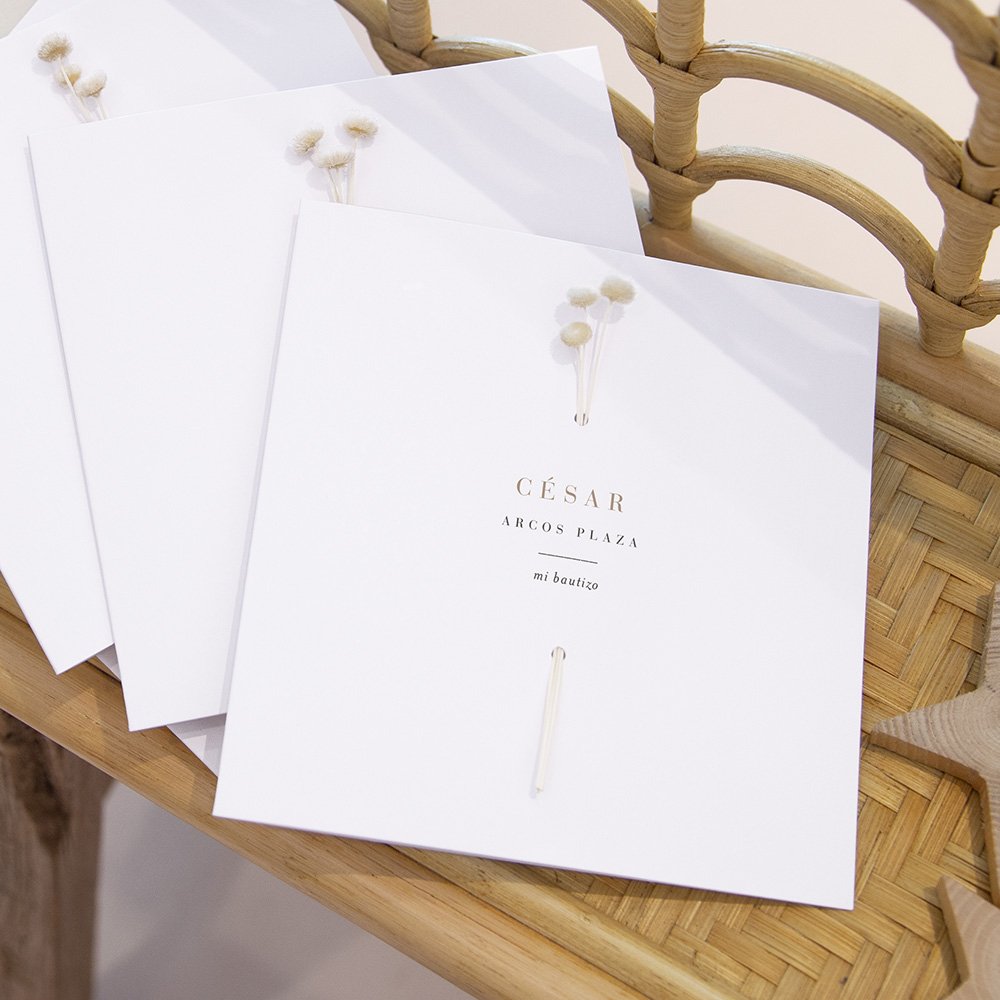 Esta invitación de bautizo, hecha con papel de calidad superior, es un díptico cuadrado que también incluye en el interior 4 fotos, además de una etiqueta con el nombre y la fecha, un recuerdo para vuestros familiares y amigos. La recibirás con las aberturas perforadas preparadas para decorarlo con flores. Coloca las flores pasando los tallos por las dos perforaciones de la tarjeta.En caso de no querer flores deberás elegir un modelo sin aberturas.