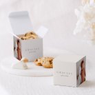 Tampoco vienen con el contenido. Como sugerencia podéis rellenarlas con nuestras peladillas elaboradas artesanalmente en el sur de Francia (propuestas como accesorio por separado). Os aconsejamos llenarlas con 20 peladillas por caja (50 g).