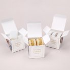 Tampoco vienen con el contenido. Como sugerencia podéis rellenarlas con nuestras peladillas elaboradas artesanalmente en el sur de Francia (propuestas como accesorio por separado). Os aconsejamos llenarlas con 20 peladillas por caja (50 g).
