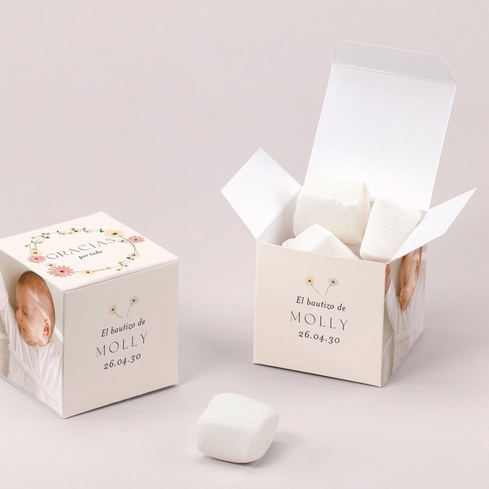 Tampoco vienen con el contenido. Como sugerencia podéis rellenarlas con nuestras peladillas elaboradas artesanalmente en el sur de Francia (propuestas como accesorio por separado). Os aconsejamos llenarlas con 20 peladillas por caja (50 g).