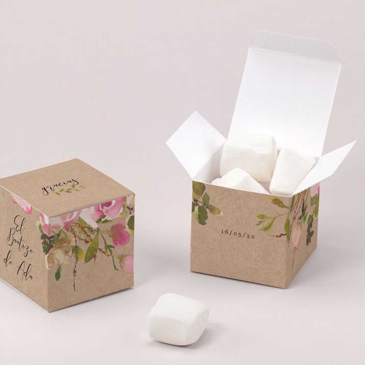 Tampoco vienen con el contenido. Como sugerencia podéis rellenarlas con nuestras peladillas elaboradas artesanalmente en el sur de Francia (propuestas como accesorio por separado). Os aconsejamos llenarlas con 20 peladillas por caja (50 g).