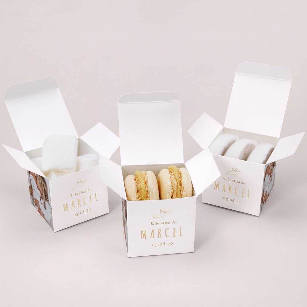 Tampoco vienen con el contenido. Como sugerencia podéis rellenarlas con nuestras peladillas elaboradas artesanalmente en el sur de Francia (propuestas como accesorio por separado). Os aconsejamos llenarlas con 20 peladillas por caja (50 g).