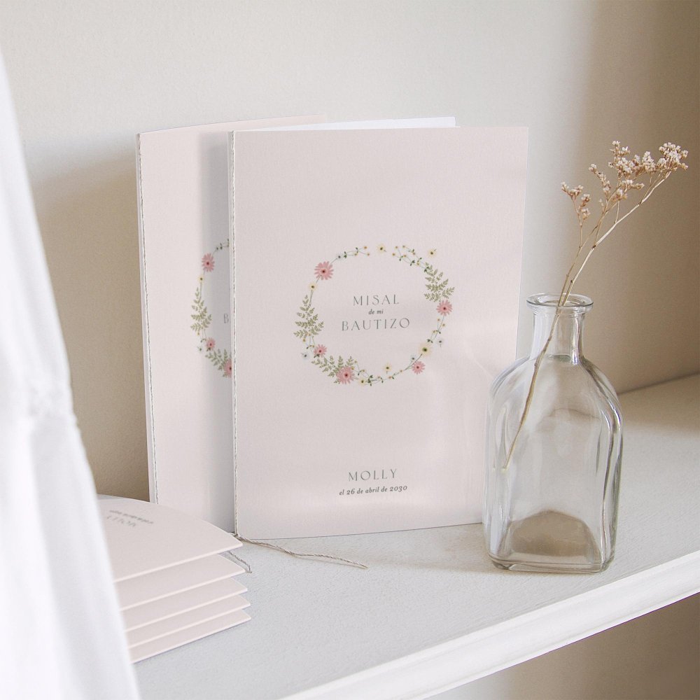 Cubierta de libro de misa en cartulina a juego con tu invitación: Se puede decorar con un lazo (se compra por separado, varios colores disponibles). Las hojas interiores no se suministran (sugerencia: Imprime las hojas interiores en papel A4, dóblalas y átalas con el lazo).