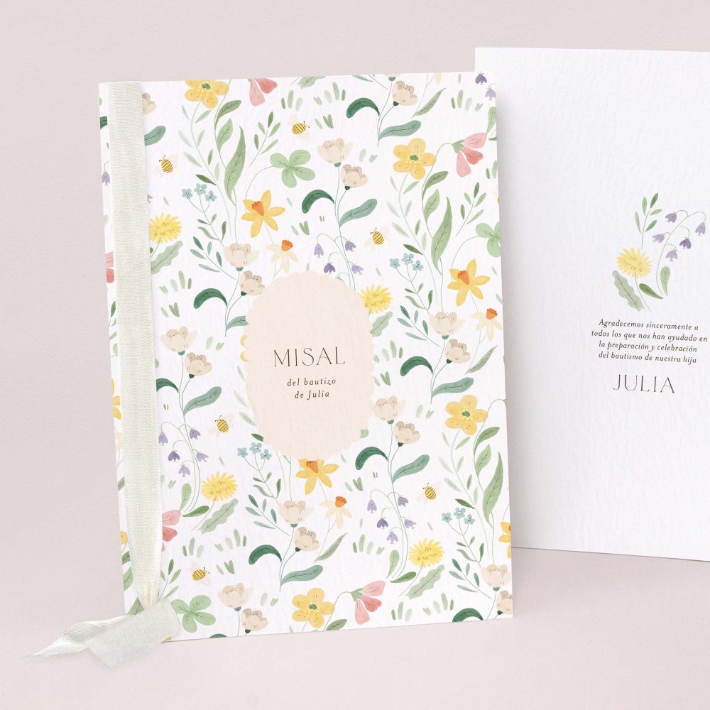 Fresca y primaveral, la invitación de bautizo Lilly Rose se viste de narcisos, violetas, diente de león y otras flores coloridas. Escondidas entre ellas hay pequeñas abejas que hacen que esta invitación sea ideal para una celebración de bautizo en primavera o en verano.