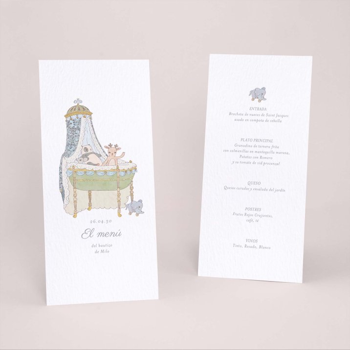 ¿Ya tienes el menú confirmado? Puedes personalizarlo a conjunto con el diseño de la invitación. Un detalla para añadir a la decoración de la mesa que encantará a tus invitados.