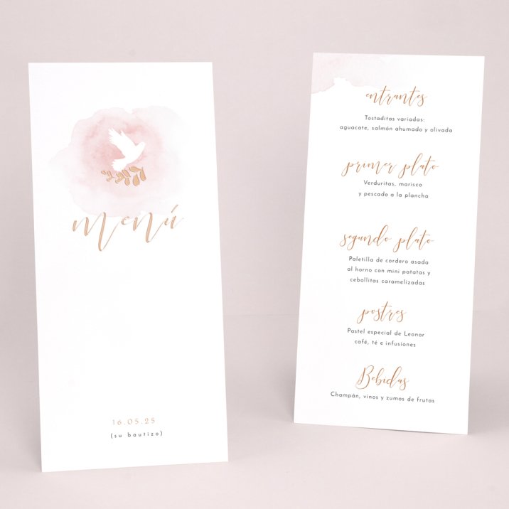 ¿Ya tienes el menú confirmado? Puedes personalizarlo a conjunto con el diseño de la invitación. Un detalla para añadir a la decoración de la mesa que encantará a tus invitados.