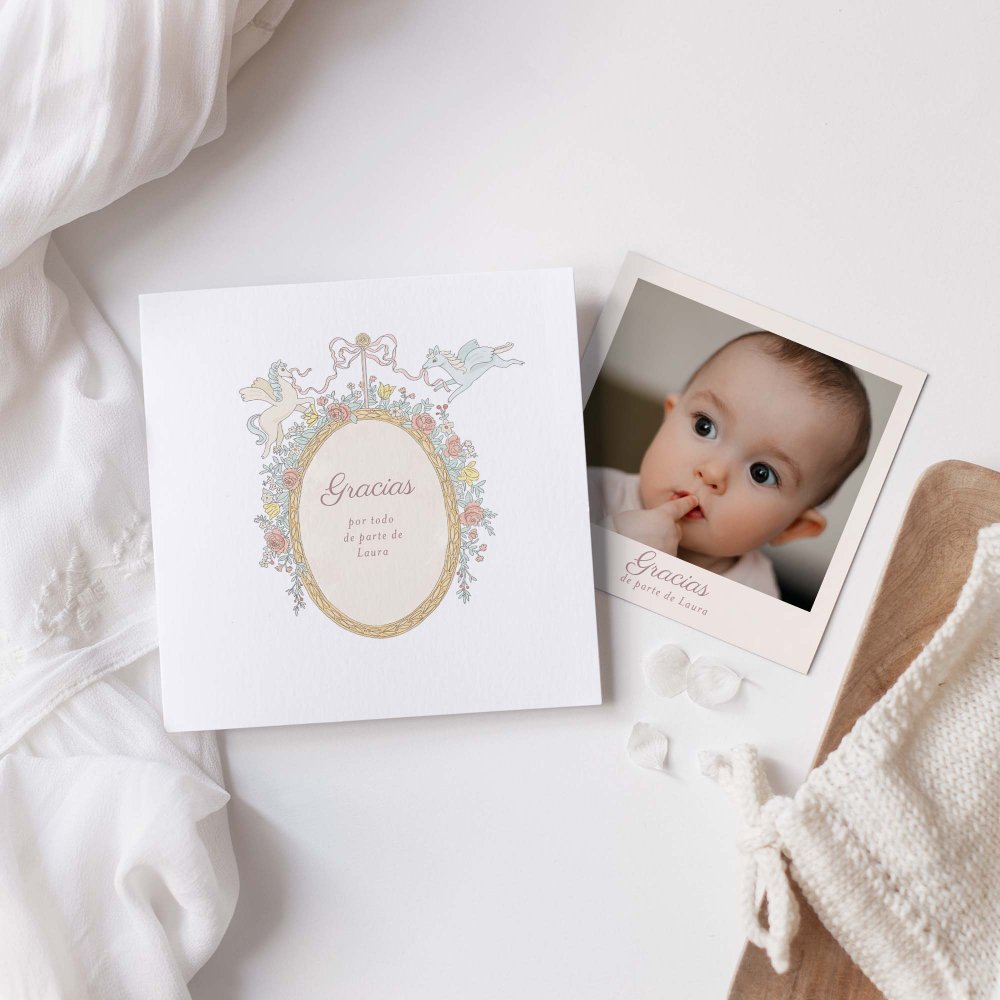 ¿Un regalo original? Envía una polaroid (no magnetizada) como tarjeta de agradecimiento.Impresa en papel mate premium texturizado para darle un toque vintage (indicamos que no es papel fotográfico).La polaroid la podréis colocar en el interior del díptico de la tarjeta. Tus familiares y amigos la podrán enmarcar, conservar, usar como decoración en un rincón de su casa... para recordar ese día tan bonito y entrañable.
