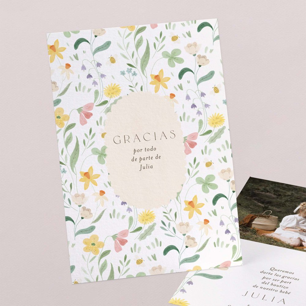Fresca y primaveral, la invitación de bautizo Lilly Rose se viste de narcisos, violetas, diente de león y otras flores coloridas. Escondidas entre ellas hay pequeñas abejas que hacen que esta invitación sea ideal para una celebración de bautizo en primavera o en verano.