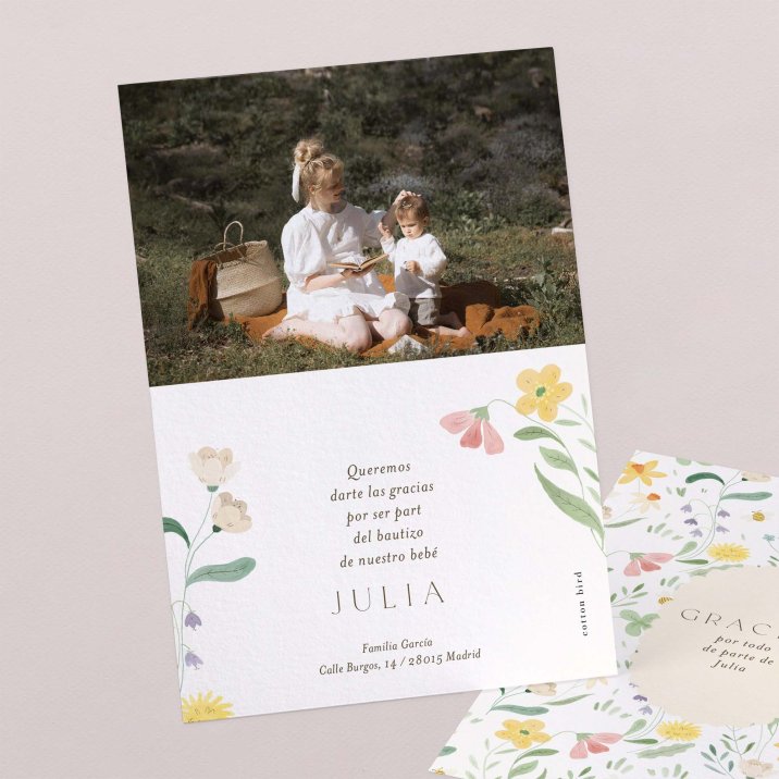 Agradece a tus seres queridos que rodearon a tu hijo en su bautizo con una bonita tarjeta de agradecimiento a juego con la invitación de este gran día.