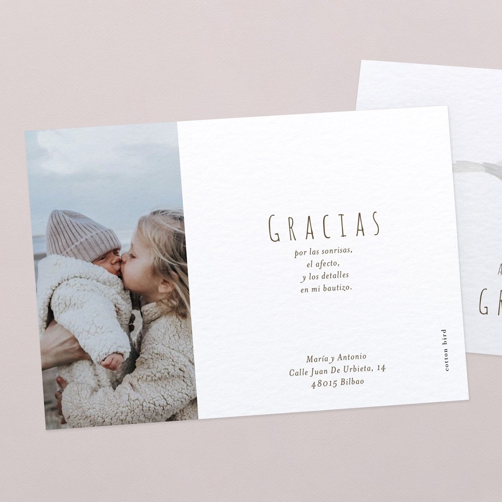 Agradece a tus seres queridos que rodearon a tu hijo en su bautizo con una bonita tarjeta de agradecimiento a juego con la invitación de este gran día.